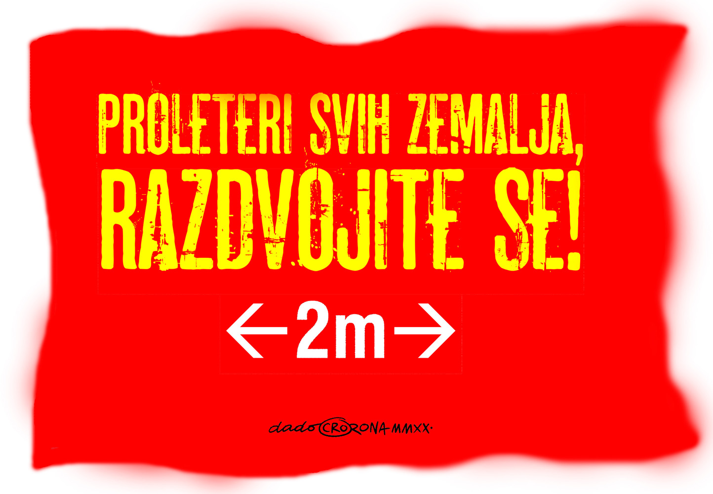 U vještom crtežu Dado kao vrsni grafičar naslikao je i prazničku zastavu Prvog svibnja, koja se koristila i za sve druge oblike borbe za ljudska prava, parafrazirajući onu internacionalnu: „Proleteri svih zemalja ujedinite se“ u aktualnu situaciju globalne zaraze: „Proleteri svih zemalja razmaknite se“, na onih obaveznih 2 metra sigurnosnih mjera.